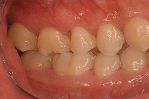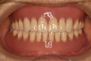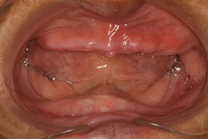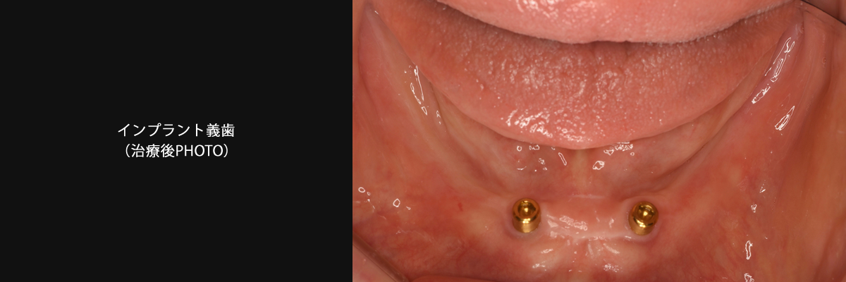 下顎の骨が著しく吸収しており、食事に制限がありましたが、治療後は楽しい食生活を送られております。